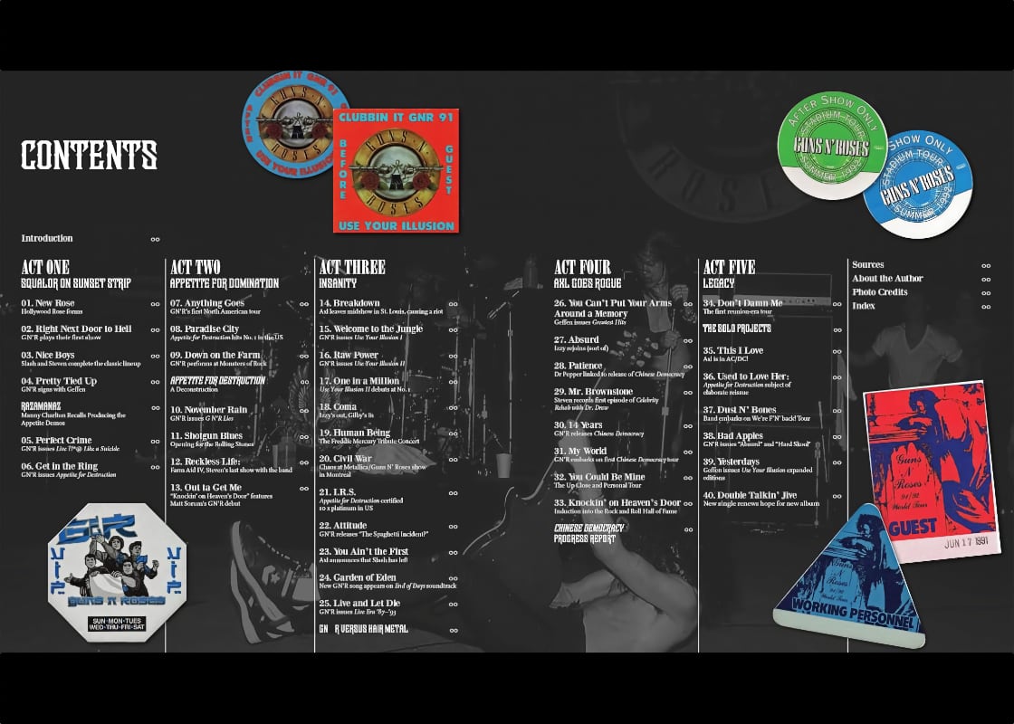 A history of the band’s scruffy early days on Hollywood’s Sunset Strip club scene Backgrounds of founding members Axl Rose, Duff McKagan, Slash, Izzy Stradlin, and Steven Adler Rundowns of the key studio albums and the processes behind them Analyses of the infamous incidents and controversies that seemed to follow the band The departures (and sometimes the returns) of key members First-person interviews with Slash and bassists Duff McKagan and Tommy Stinson